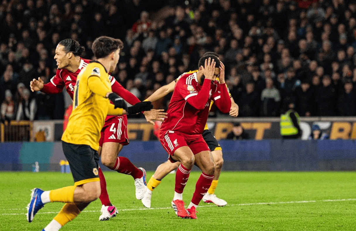 然后就是补时第94分钟,最致命的一击。阿利松毫无压力的大脚开球直接失误,送到狼队球员安德烈脚下。安德烈起脚远射,打在戈麦斯身上发生致命折射,越过阿利松坠入网窝。2比1,绝杀。